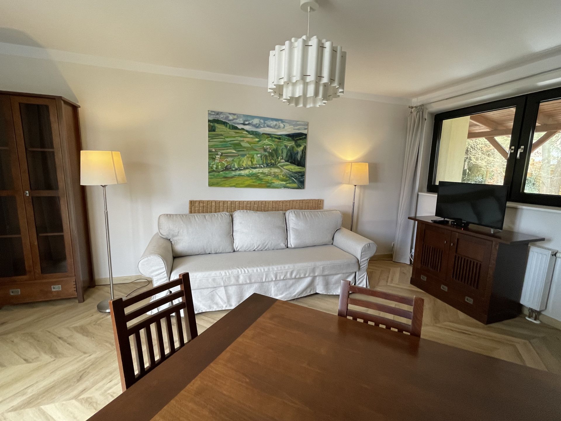 - pokój dzienny z dużym stołem, aneksem kuchennym + rozkładana kanapa (2-os.)